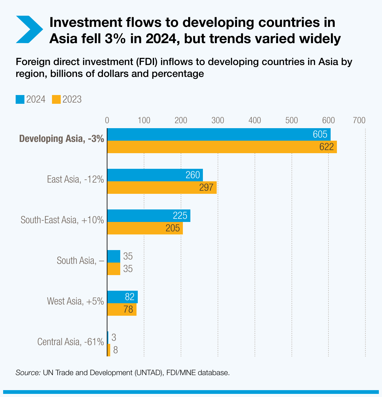 En 2024, las economías en desarrollo de Asia atrajeron 605.000 millones de dólares en inversión extranjera directa (IED), según el último “World Investment Report 2025” (Informe sobre las inversiones en el mundo 2025) publicado hoy por la ONU Comercio y Desarrollo (UNCTAD).