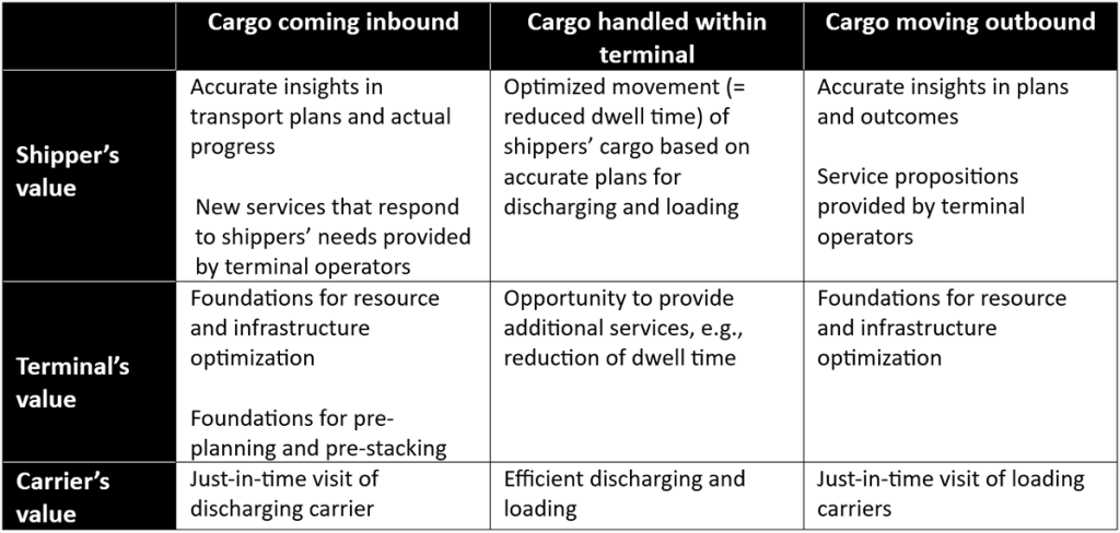The shippers expect goods to be delivered as originally communicated by the carriers. Cargo owners know that things can change or go wrong, but they require transparency about what happens and updated transport plans, and this, ideally when deviations and updates occur and not much later. This would empower cargo owners to inform their partners and take corrective action if possible and needed. Terminals use their track and trace systems and share information with the carriers via EDI or Web Services. Carriers, including freight forwarders, display data in their portals visible to the shippers, but regularly late, and the date can diverge significantly between different actors. Furthermore, terminals are usually not informed about the details of the cargo owner or consignee. The carriers hold that information. They are the single point of contact for the shipper for container information and they bill the cargo owners for the services related to the container.