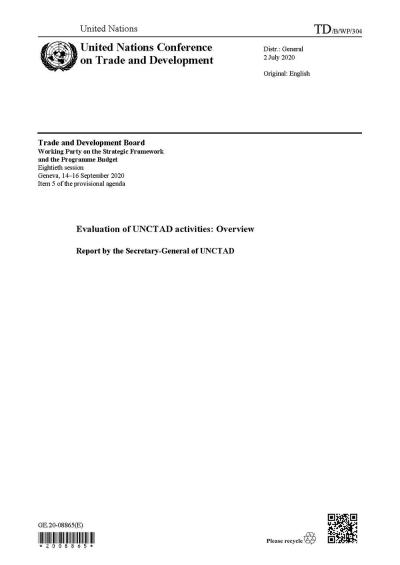 Downloads Evaluation of UNCTAD activities: Overview (July 2019 to June 2020) (TD/B/WP/304) 2 Jul 2020 - Agenda item 5 English | Français | Español | Русский | 简体中文 | العربية Sign up for our Insights newsletter. Get trusted intelligence on global trade, the economy and development in your inbox. Subscribe RelatedProgramEvaluation at UNCTADSeriesEvaluation Reports - Overviews KeywordsTechnical cooperation