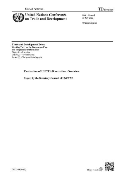 Downloads Evaluation of UNCTAD activities: Overview (July 2021 to June 2022) (TD/B/WP/316) 22 Jul 2022 English | Français | Español | العربية | 简体中文 | Русский Sign up for our Insights newsletter. Get trusted intelligence on global trade, the economy and development in your inbox. Subscribe RelatedProgramEvaluation at UNCTADSeriesEvaluation Reports - Overviews KeywordsTechnical cooperation