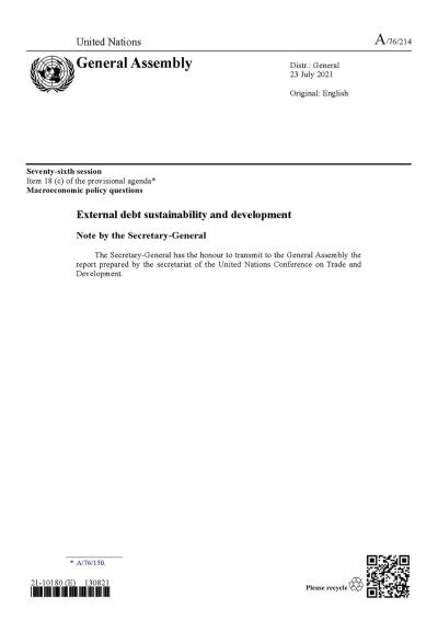 Report of the United Nations Secretary-General Downloads External debt sustainability and development (2021) - Report of the United Nations Secretary-General (A/76/214) 23 Jul 2021 English | Français | Español | العربية | 简体中文 | Русский RelatedTopicDebt and development financeSeriesExternal debt sustainability and development (UNSG Reports) KeywordsExternal debtDebt sustainability