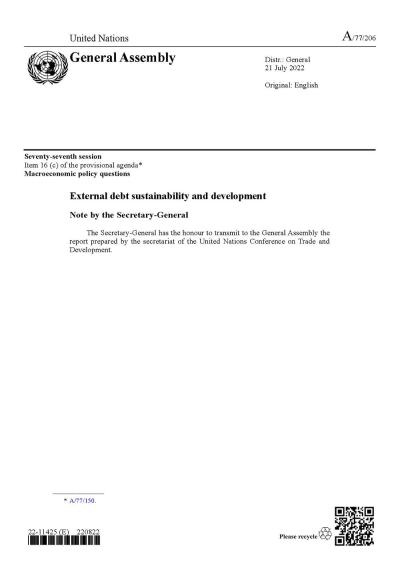Report of the United Nations Secretary-General Downloads External debt sustainability and development (2022) - Report of the United Nations Secretary-General (A/77/206) 21 Jul 2022 English | Français | Español | العربية | 简体中文 | Русский RelatedTopicDebt and development financeSeriesExternal debt sustainability and development (UNSG Reports) KeywordsExternal debtDebt sustainability