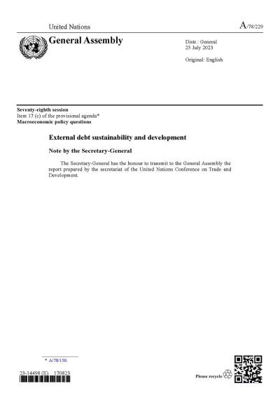 Report of the United Nations Secretary-General Downloads External debt sustainability and development (2023) - Report of the United Nations Secretary-General (A/78/229) 25 Jul 2023 English | Français | Español | العربية | 简体中文 | Русский RelatedTopicDebt and development financeSeriesExternal debt sustainability and development (UNSG Reports) KeywordsExternal debtDebt sustainability