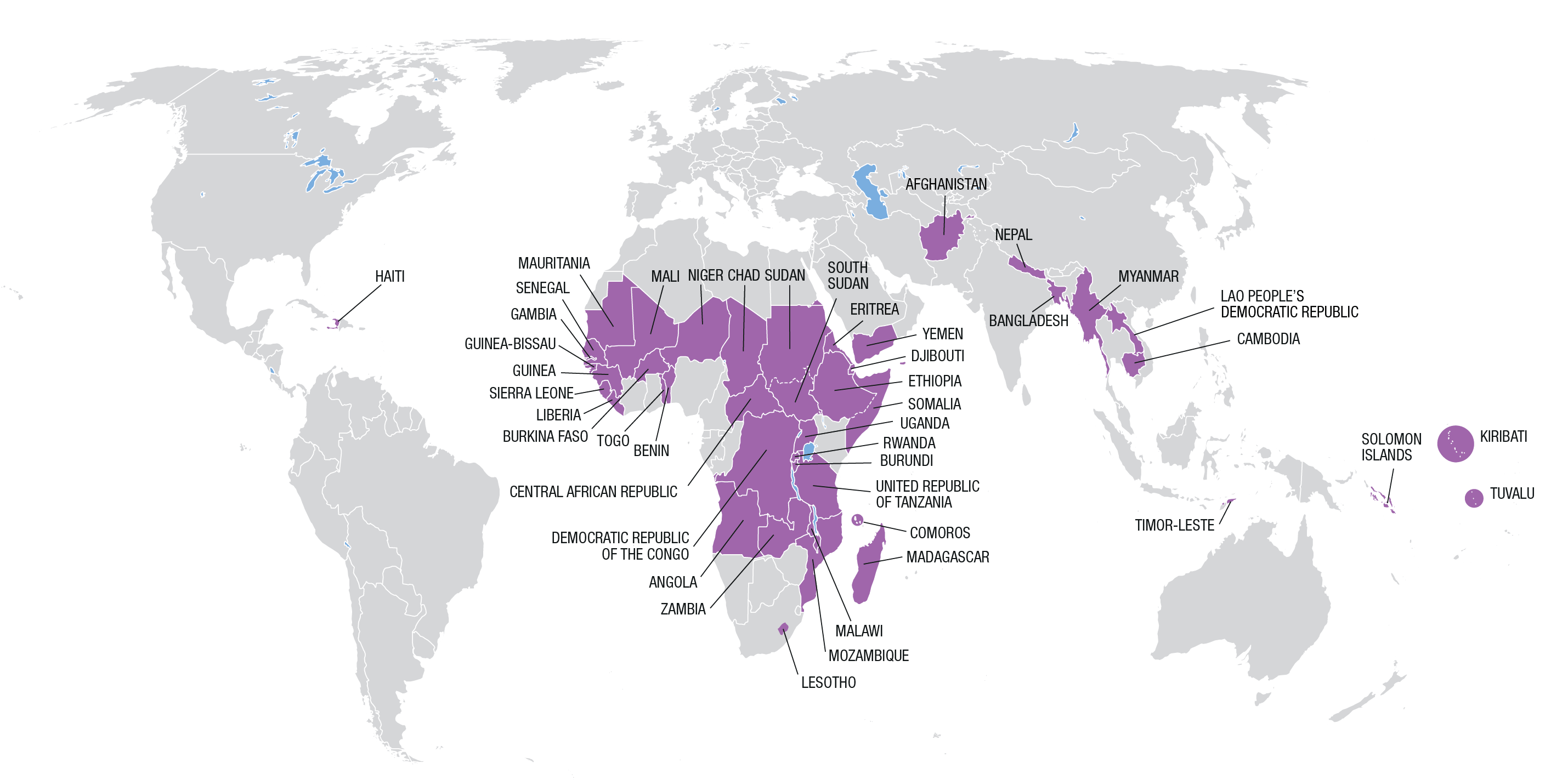 - Africa (32): Angola, Benin, Burkina Faso, Burundi, Central African Republic, Chad, Comoros, Democratic Republic of the Congo, Djibouti, Eritrea, Ethiopia, Gambia, Guinea, Guinea-Bissau, Lesotho, Liberia, Madagascar, Malawi, Mali, Mauritania, Mozambique, Niger, Rwanda, Senegal, Sierra Leone, Somalia, South Sudan, Sudan, Togo, Uganda, United Republic of Tanzania and Zambia.
