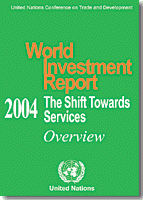 Downloads WORLD INVESTMENT REPORT 2004 - OVERVIEW (UNCTAD/WIR/2004 (Overview)) 21 Sep 2004 English | Français | Español Chapter I 21 Sep 2004 English Chapter II 21 Sep 2004 English Chapter III 21 Sep 2004 English Chapter IV 21 Sep 2004 English Chapter V 21 Sep 2004 English Chapter VI 21 Sep 2004 English Annexes 21 Sep 2004 English Questionnaire 21 Sep 2004 English Sign up for our Insights newsletter. Get trusted intelligence on global trade, the economy and development in your inbox. Subscribe RelatedSeriesWorld Investment Report