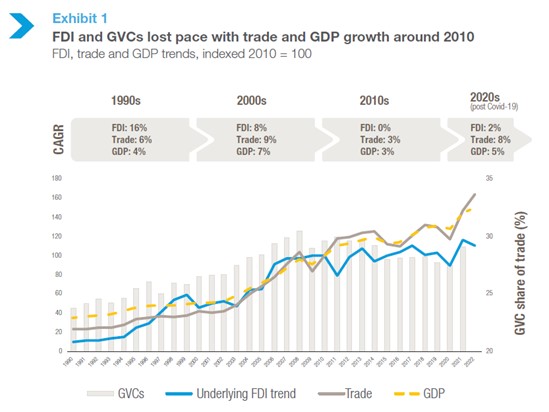 En primer lugar, el crecimiento de la IED y de las cadenas de valor mundiales ya no está alineado con el crecimiento del PIB y del comercio, lo que indica un cambio significativo en la economía mundial.