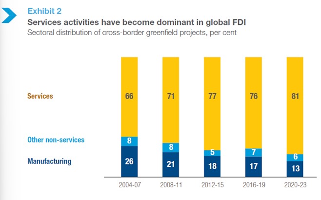De 2004 a 2023, la proporción de proyectos transfronterizos totalmente nuevos en el sector servicios creció del 66% al 81%.